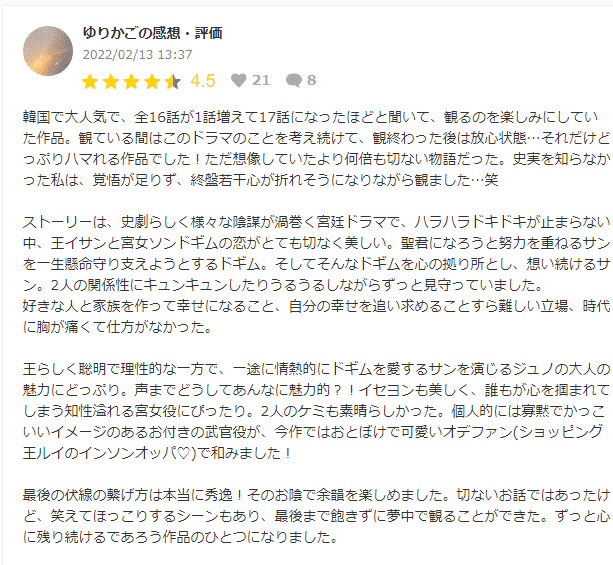 このドラマは開始から視聴率がぐんぐん伸び最終話では17.2%を記録。2021年ミニドラマの中では4位です。このドラマが成功した一番の要因はサンとドクイムの絶妙のやりとり、サンとドクイムを演じた役者たちの演技のうまさと言われています。