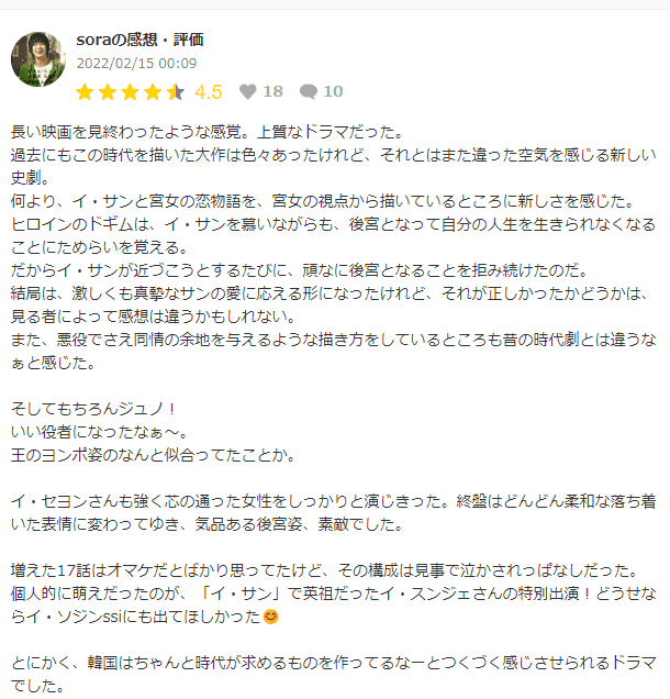 イサンが当時の一般庶民や現在の韓国国民に好かれるのは波乱万丈の人生が面白すぎる事、民の上に君臨する覇者ではなく民に身を捧げる奉仕者として民を愛し太平の世の中を築いた事。そして数々のエピソードから浮かび上がってくる彼の人間臭さが彼を雲の上の存在でなく身近な人間に感じさせた事です。