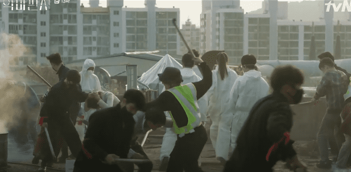 ガオンの言葉が気にかかったチンジュは現場に行きます。立ち入り禁止区域ですが今や財団の顔になっているチンジュは顔パスで入れてもらえます。そして免疫防護服を着ていない普段のユニフォームの公権力が一般市民をボコボコにしている姿を目の当たりにします。